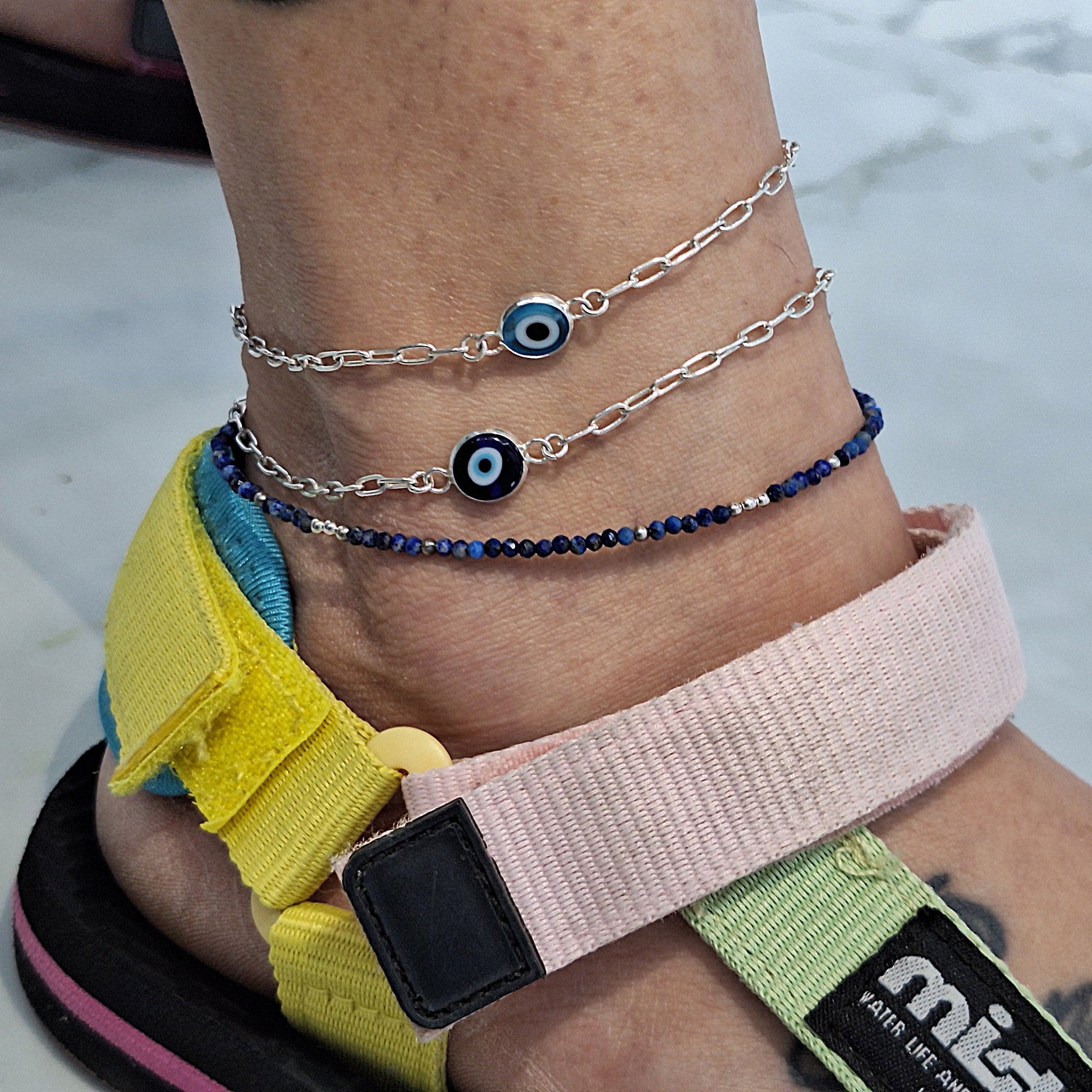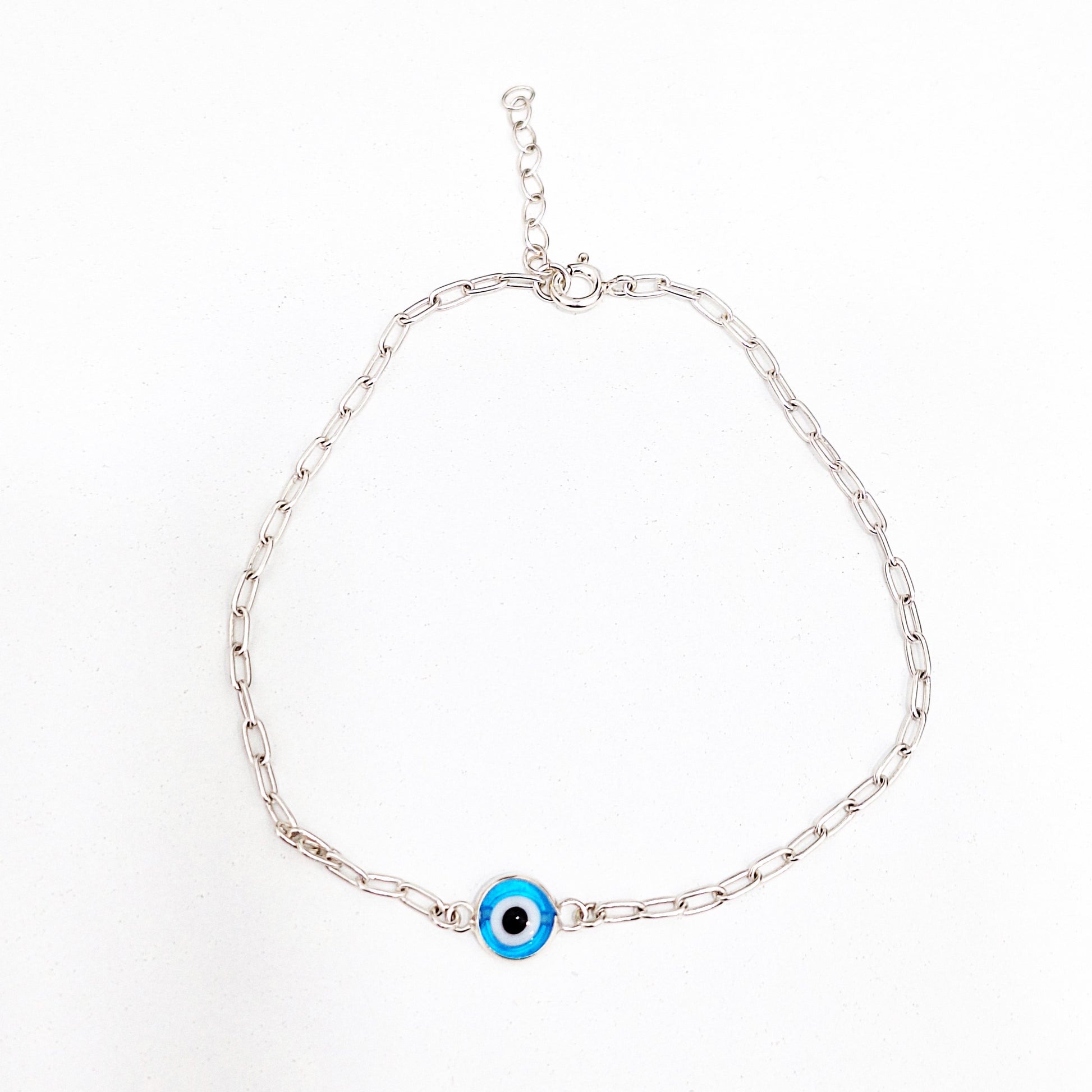 Tobillera hecha en Plata de ley 925 con diseño de cadena de eslabones con un ojo turco de piedra en el centro engarzado en una base de Plata.