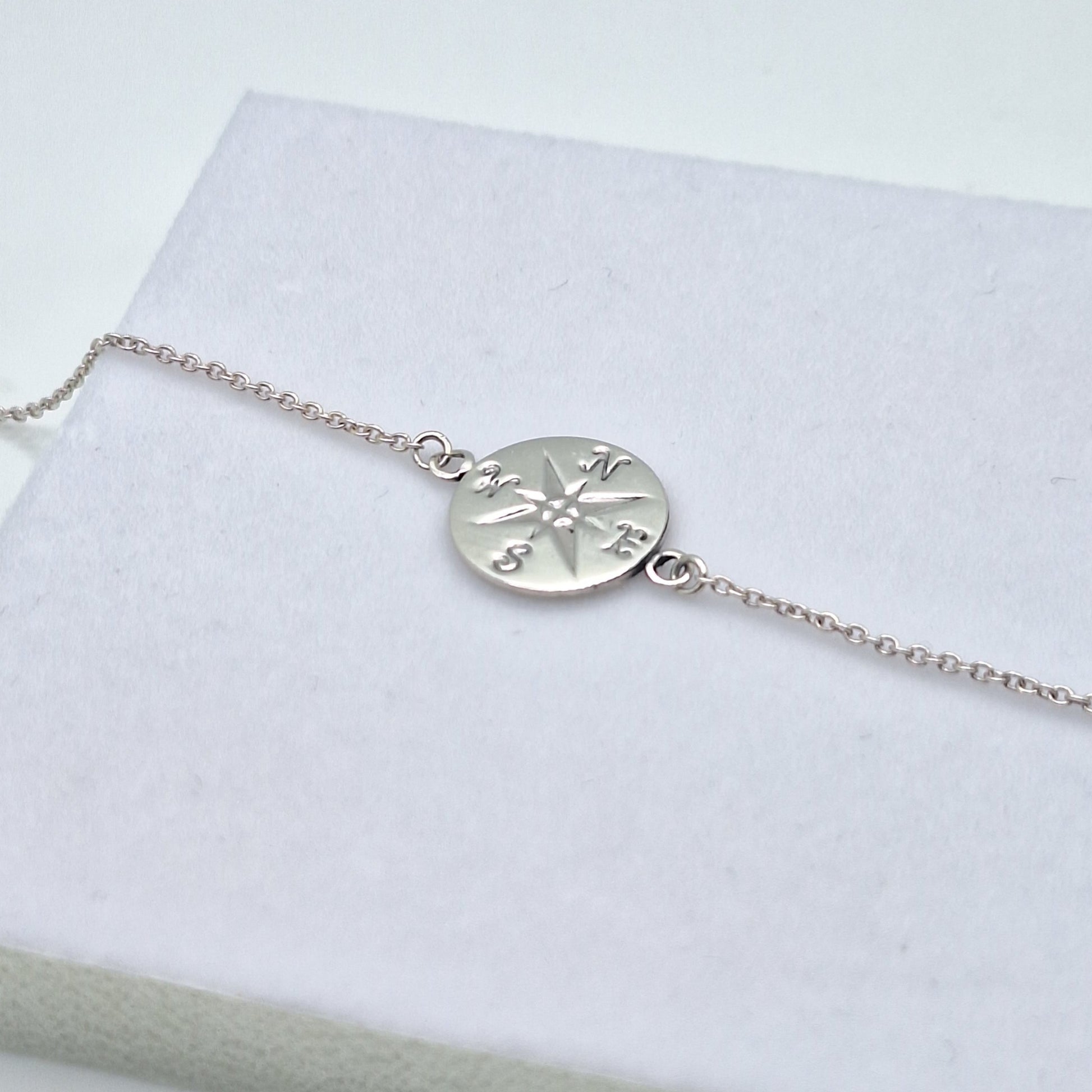 Pulsera hecha en Plata 925 de pequeños eslabones con una brújula en el centro. Largo 16cm+2 de extensión. Peso: 2,75gr