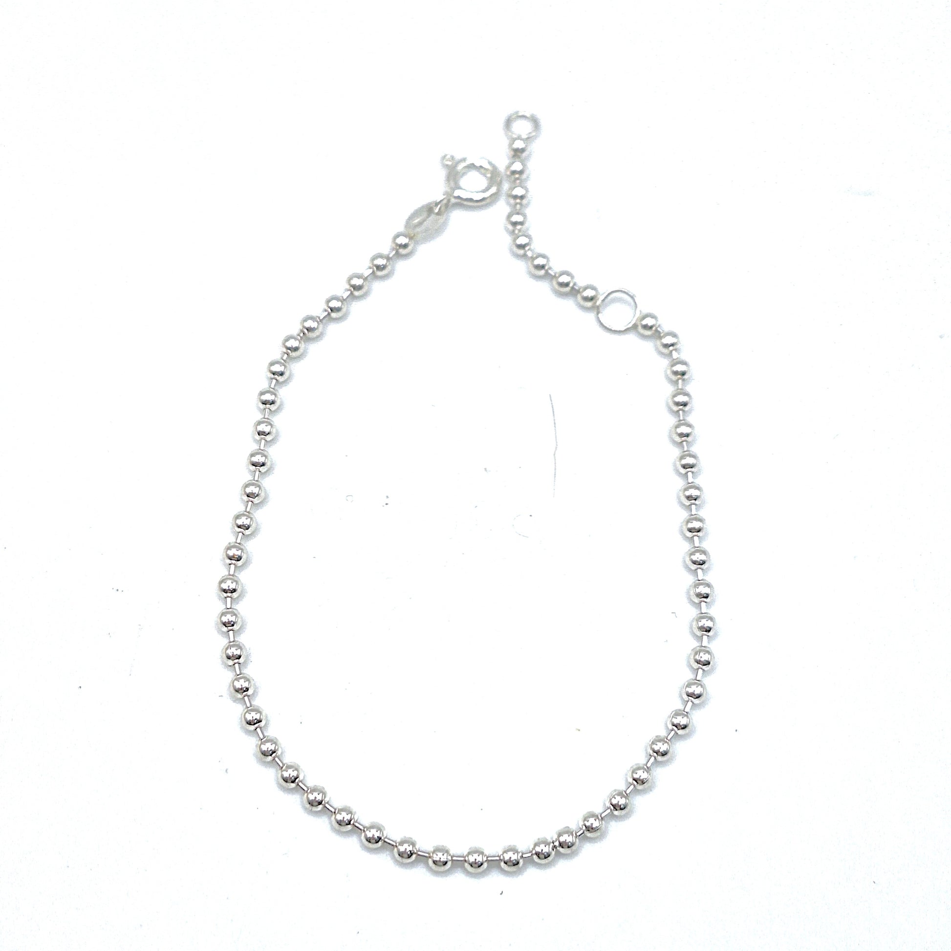 Pulsera hecha en plata 925. Tiene diseño de bolitas, tipo cadena de water, ajustable en dos medidas. 18cm y 21cm. Peso: 3,41gr.
