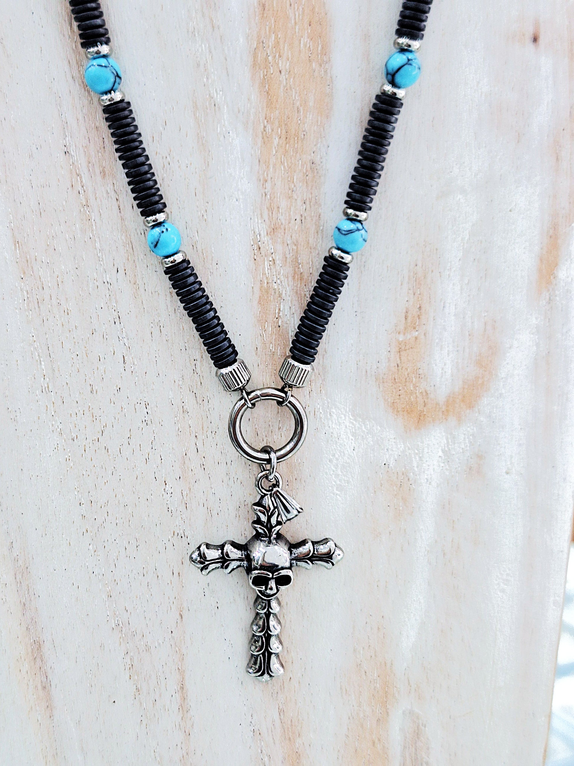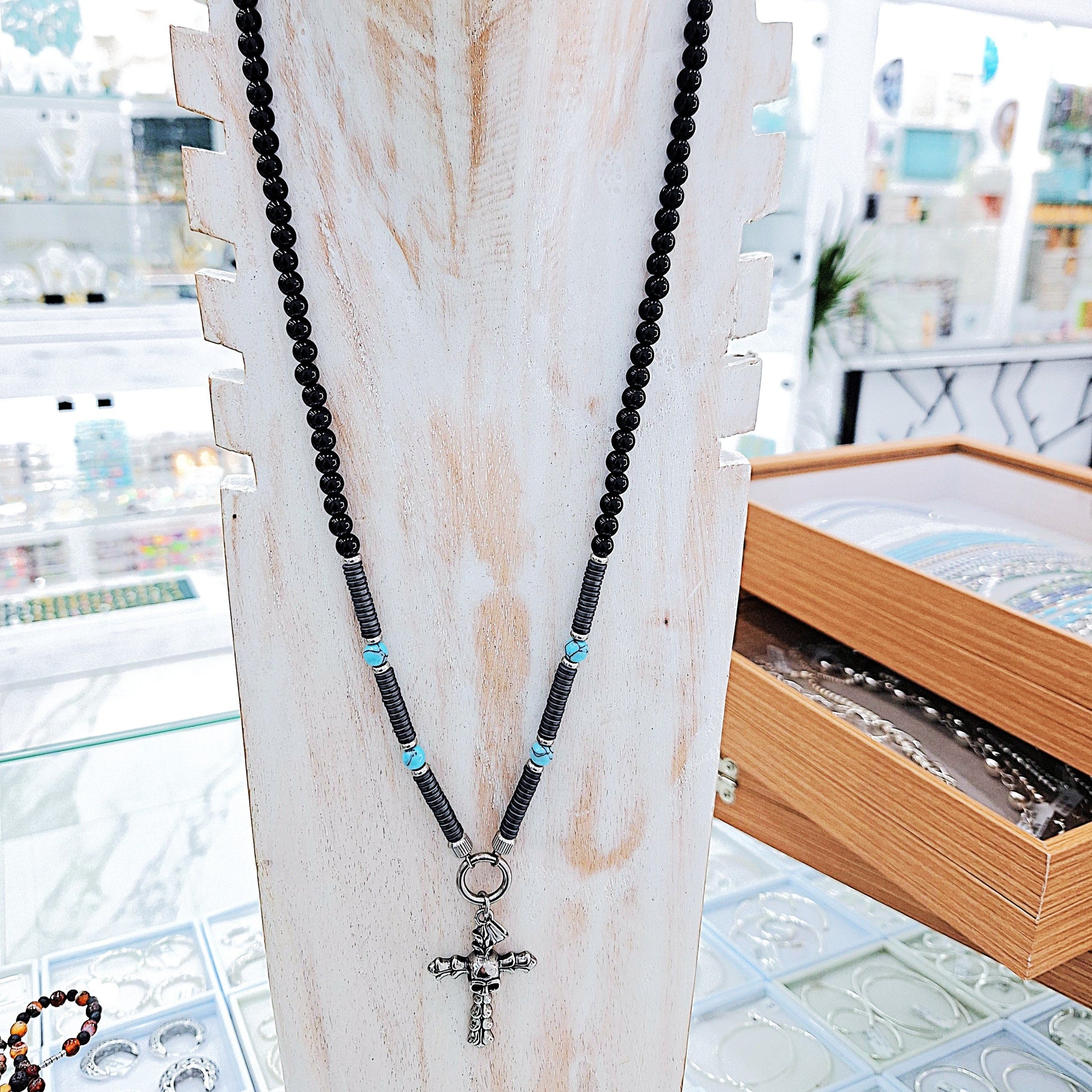Collar de hombre, hecho en bolas de piedra Onix con acero y colgante de acero. 50cm