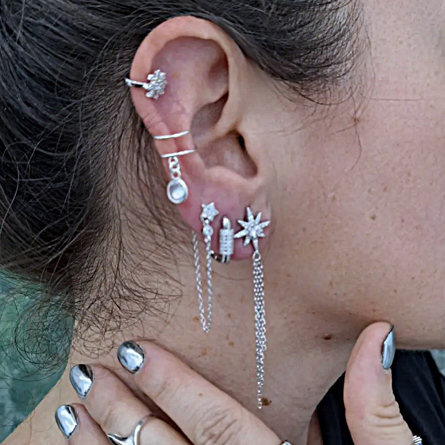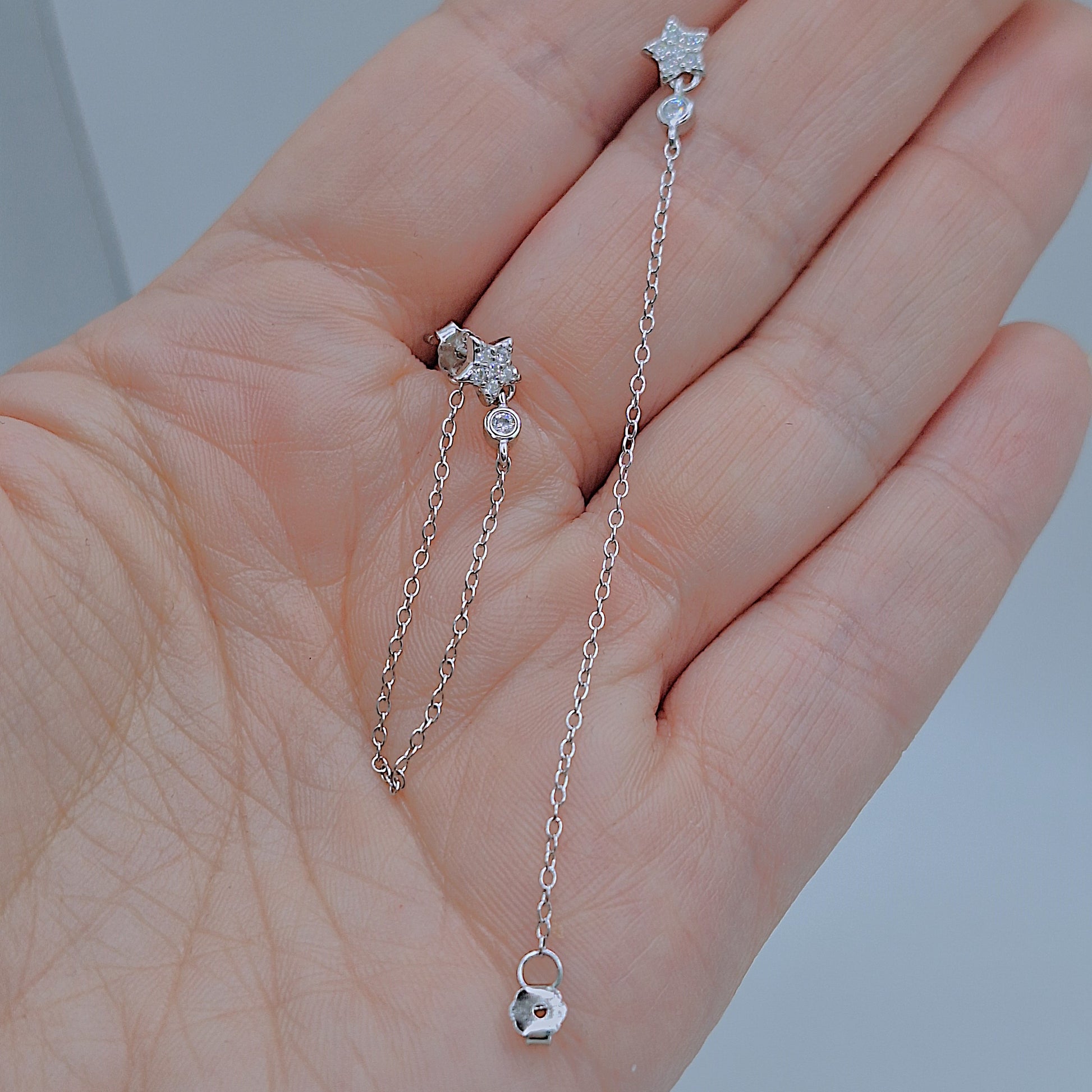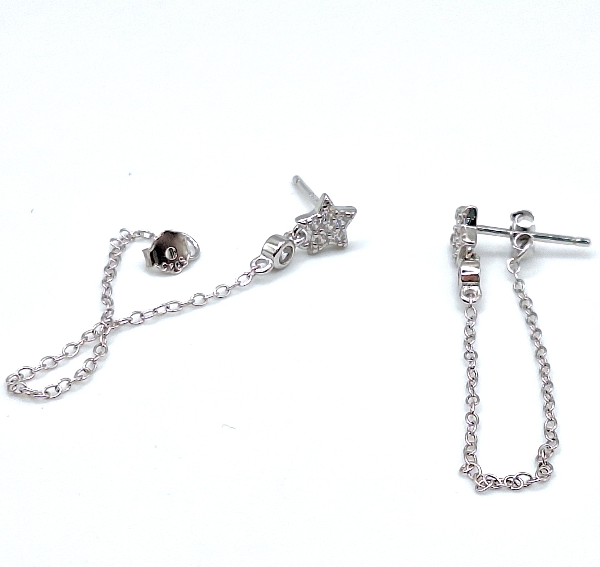 Pendiente hecho de plata con estrella en micropavé y cadena que rodea la oreja por debajo del lobulo. Peso: 1,11g/par Tamaño:5x38mm
