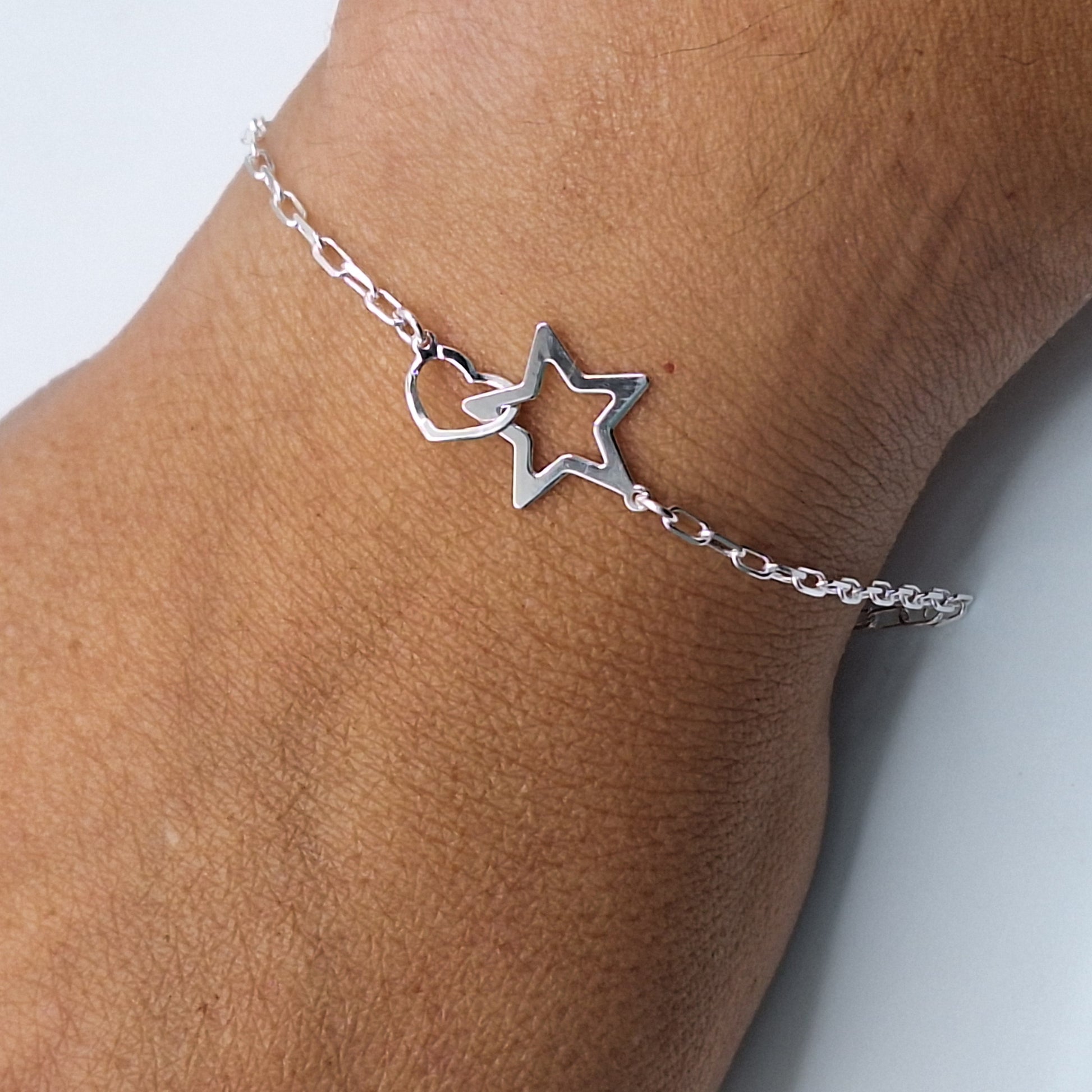 pulsera de plata 925 con eslabones y detalle de un corazón enlazado con una estrella. Largo: 17cm + 2 de extension .Peso: 1,87