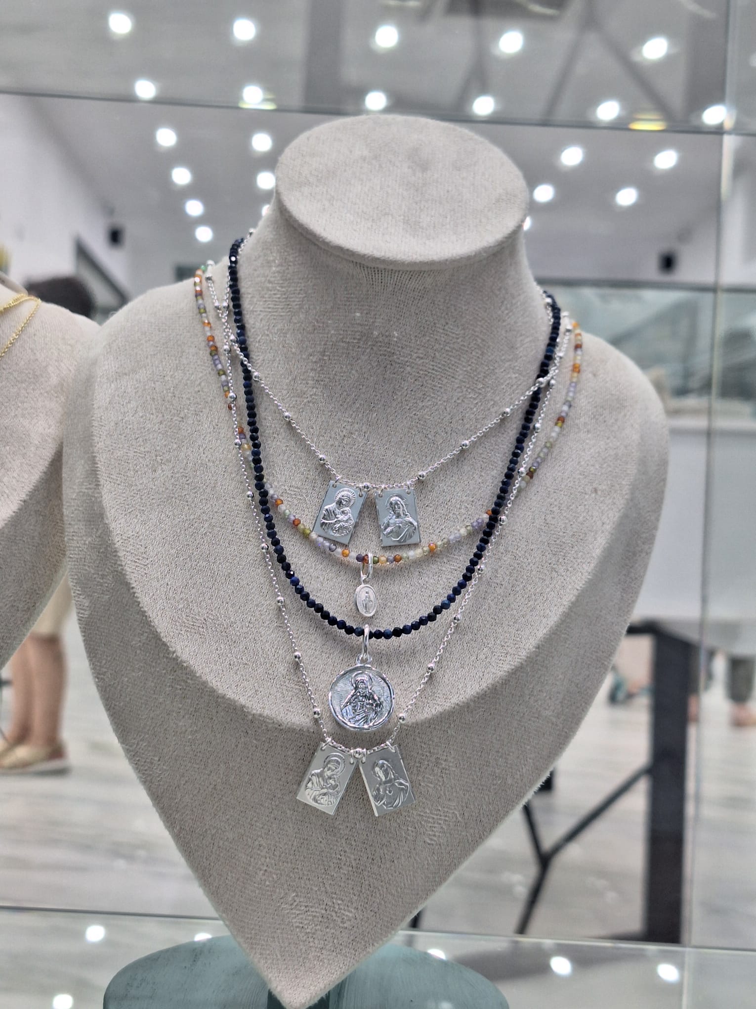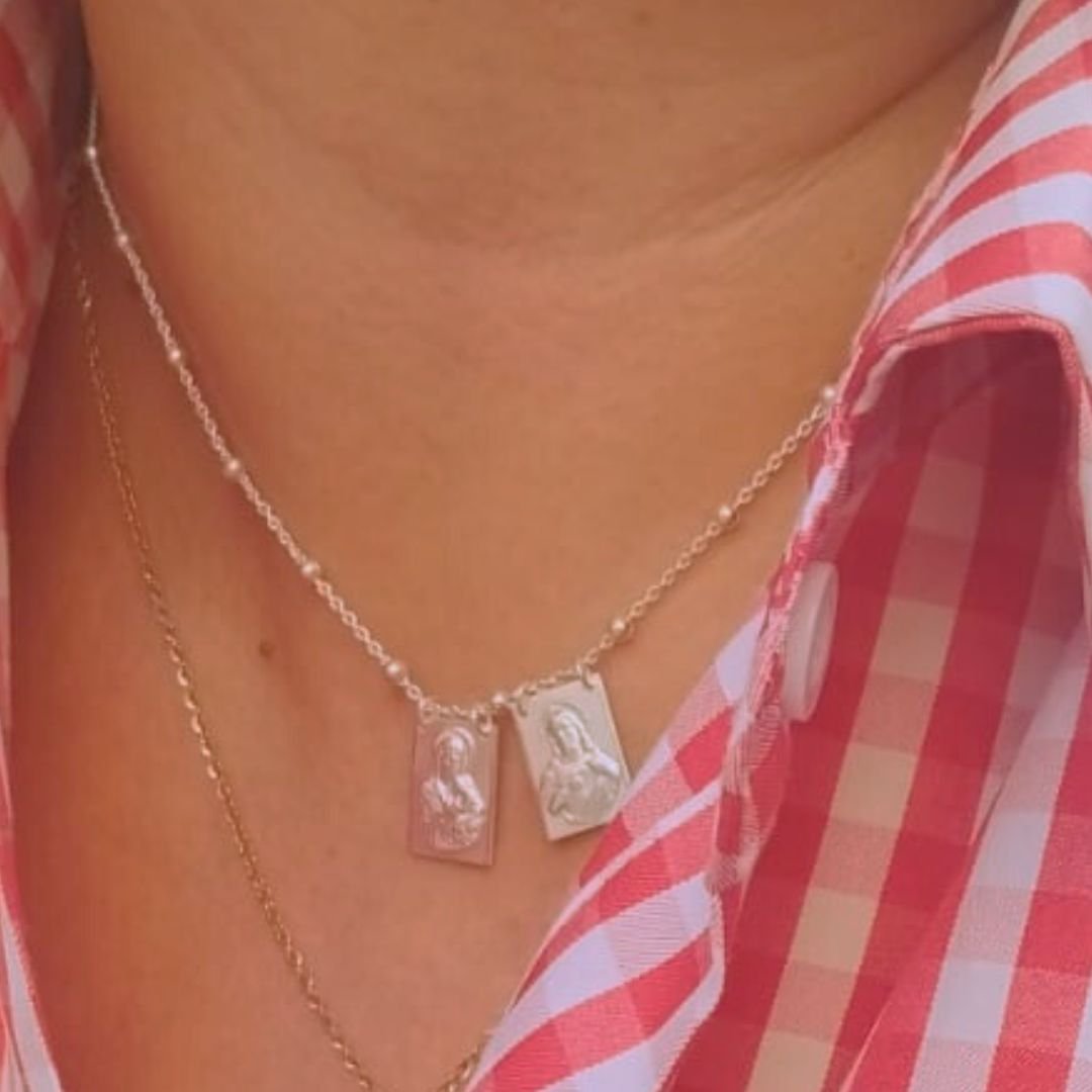 Escapularios hechos en Plata de Ley 925. La cadena tiene un diseño muy actual de patrón cadena-bola, con dos escapularios con la Virgen del Carmen y el Sagrado corazón.