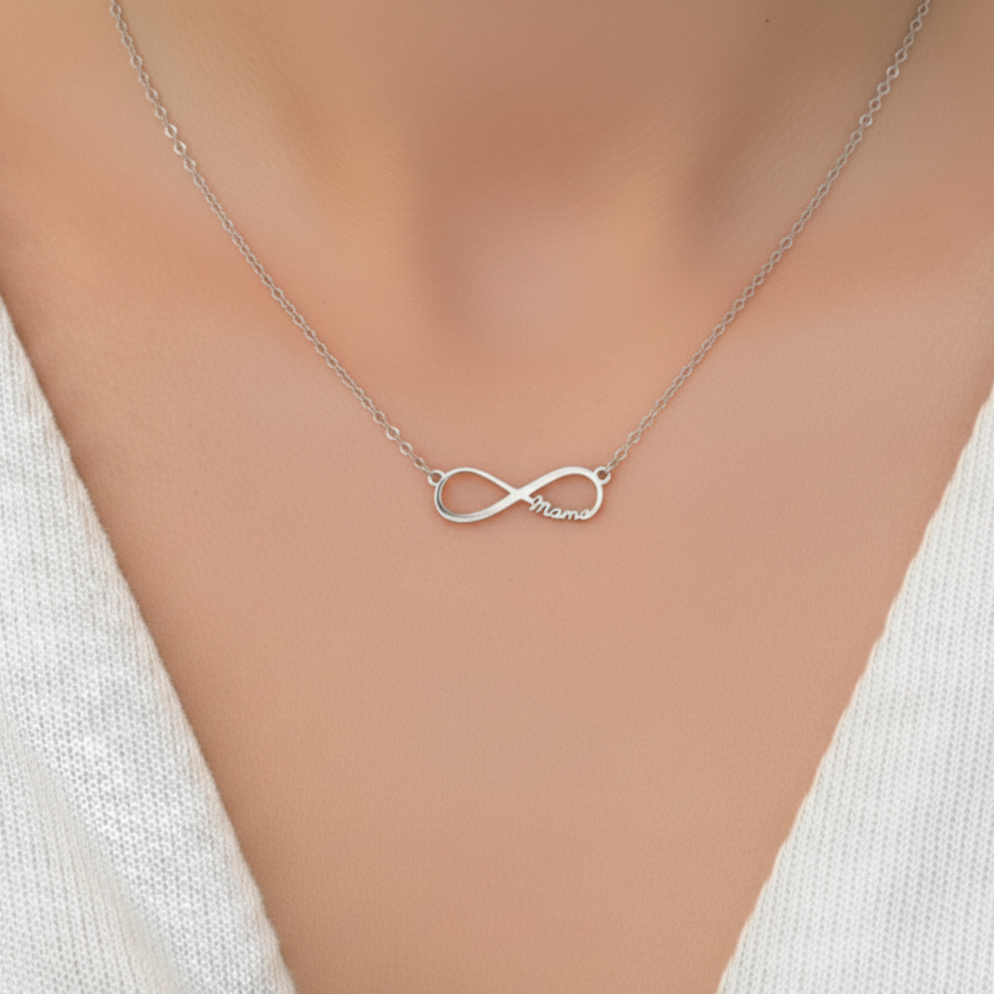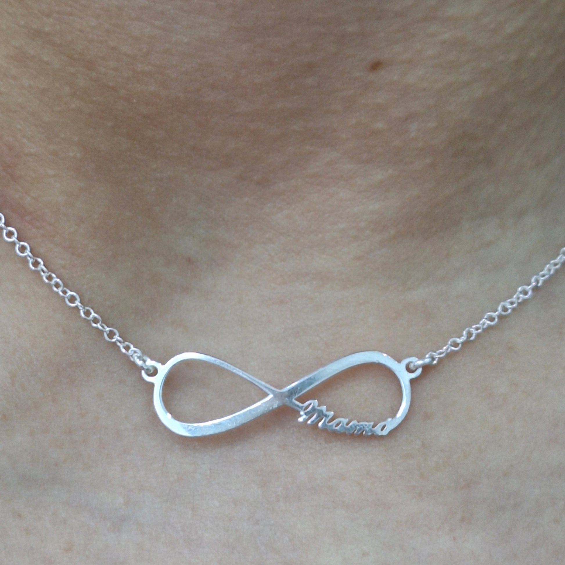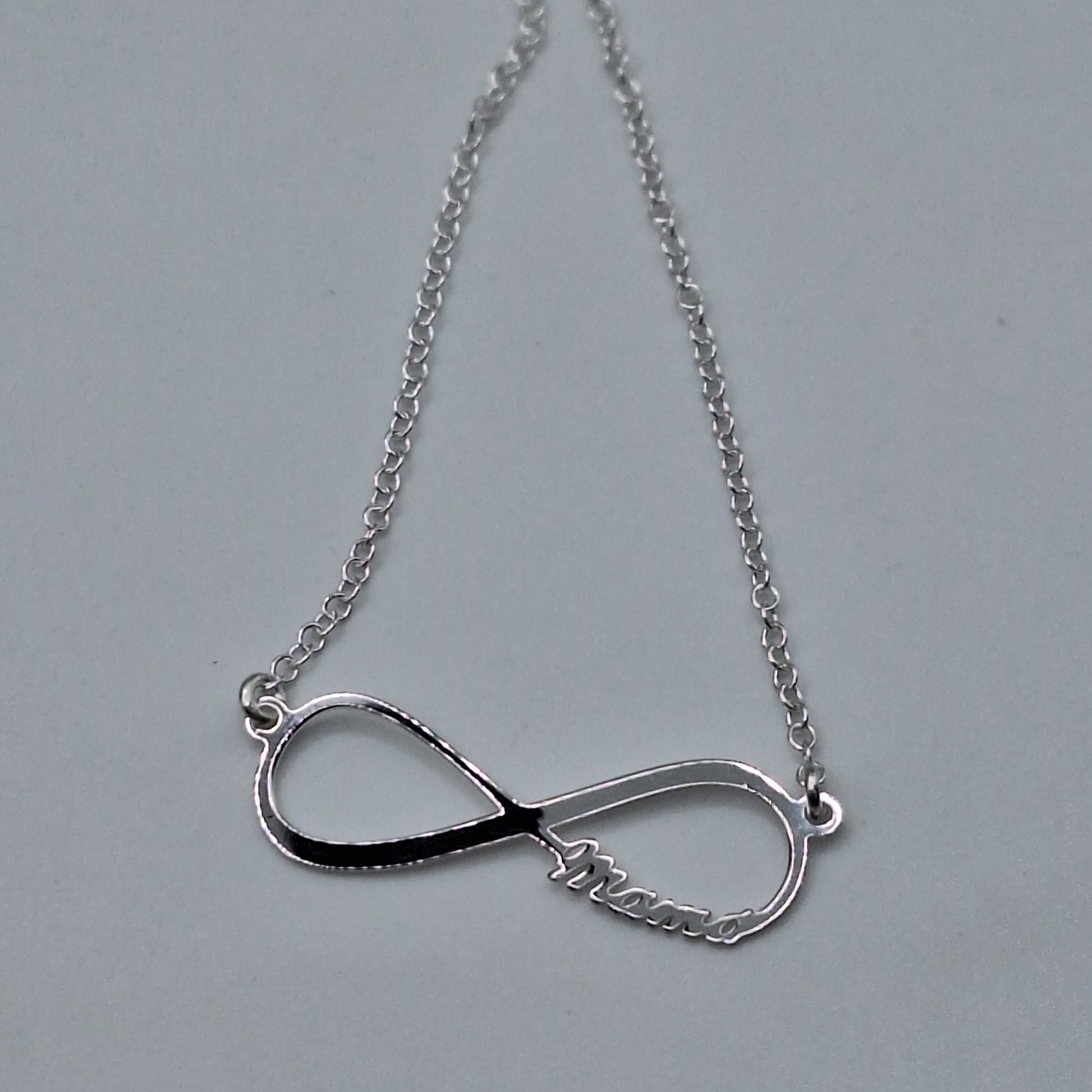 Cadena hecha en plata 925. Un infinito con el nombre de mama en unos de sus lados enganchado a una cadena por sus extremos de eslabones pequeños. Largo: 40 cm Peso; 2,36gr