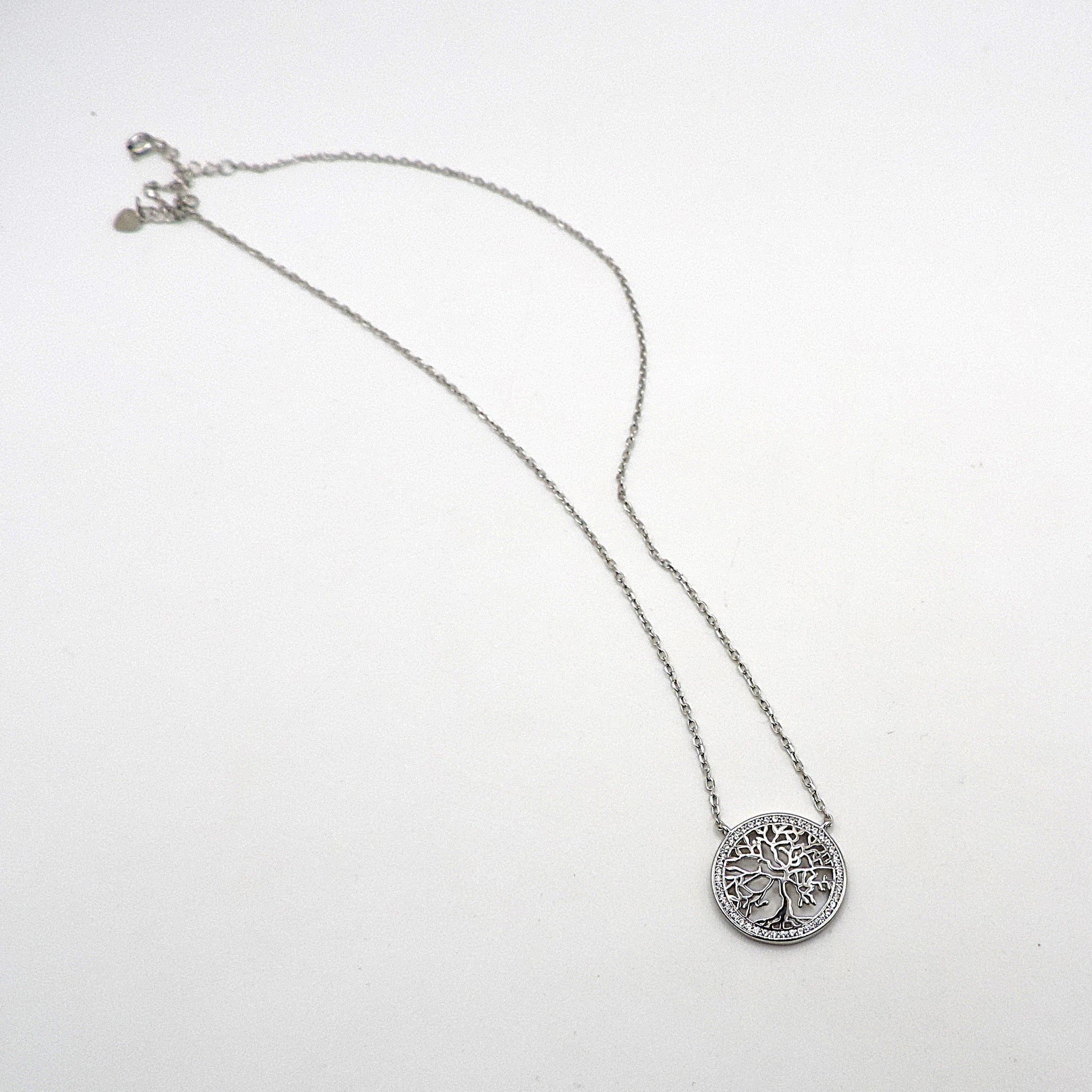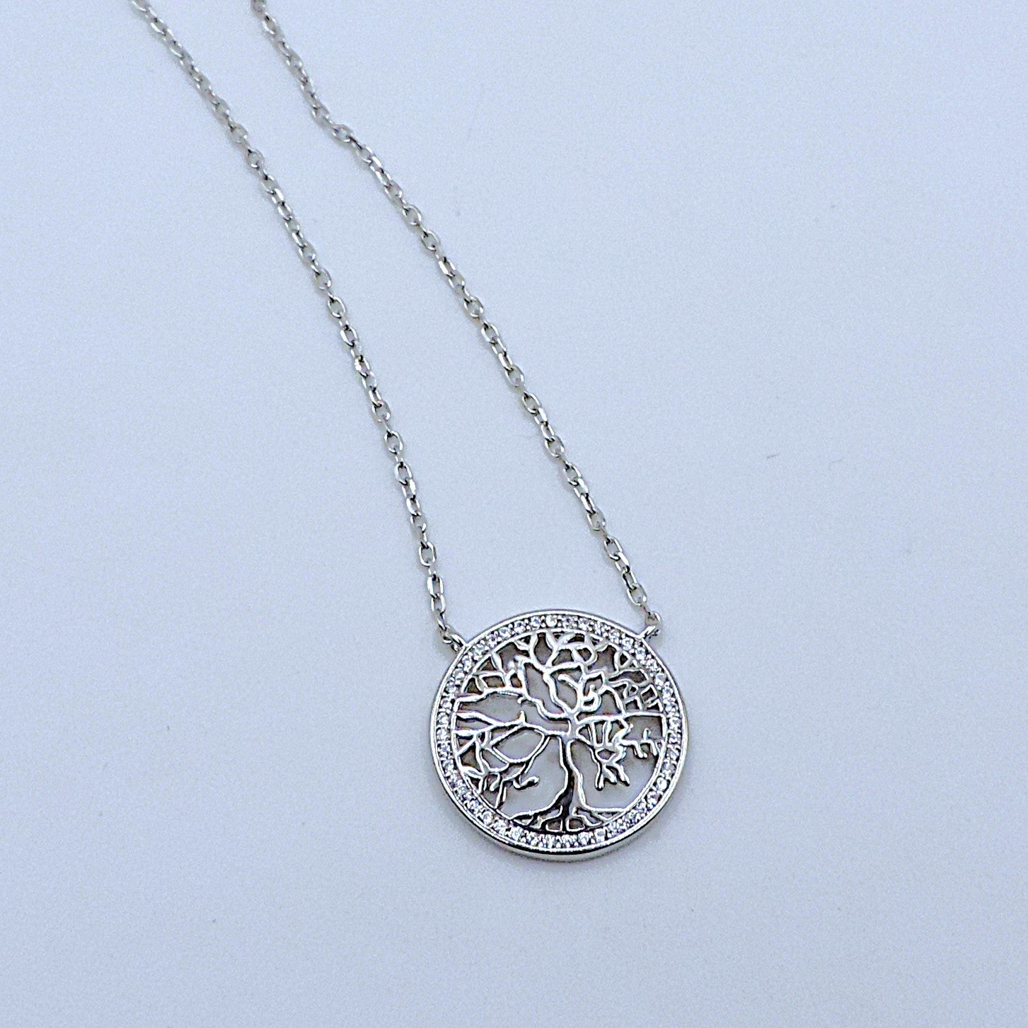 Cadena de Plata 925 con colgante de circonitas engarzadas con método de micropavé. Diseño de árbol de la vida. significativo para la familia. Largo cadena: 45cm Tamaño colgante: 1,7 cm de diametro. Peso: 3,40gr