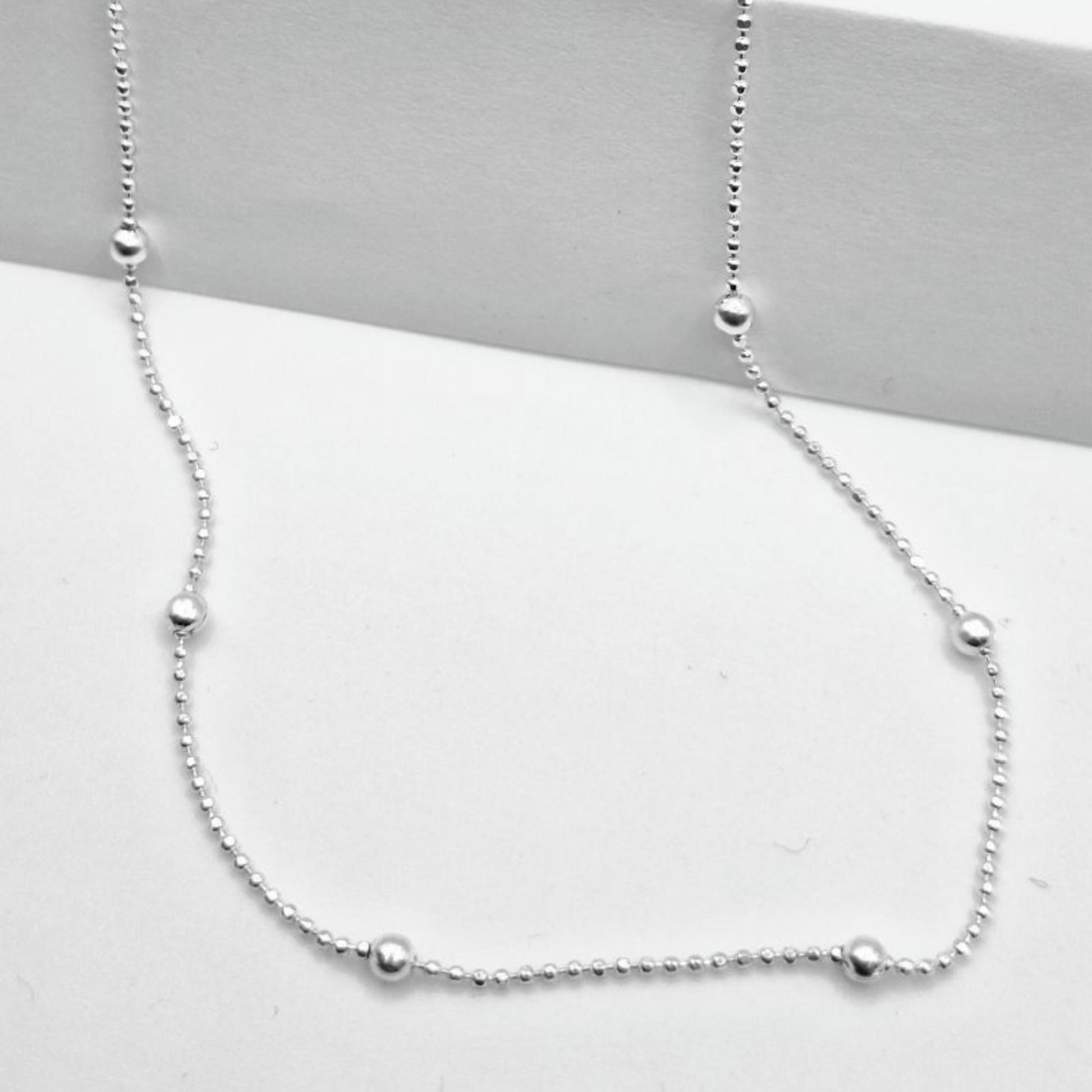 Cadena hecha en Plata de ley 925. Formada por una cadena de plata en forma de bolitas y con detalles de bolas mas grandes. Es plata Facetada. Peso: 2,04 gr.