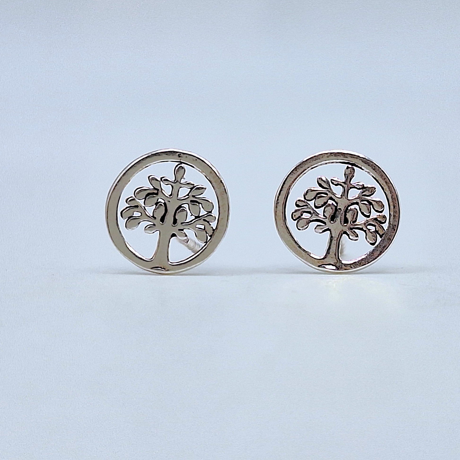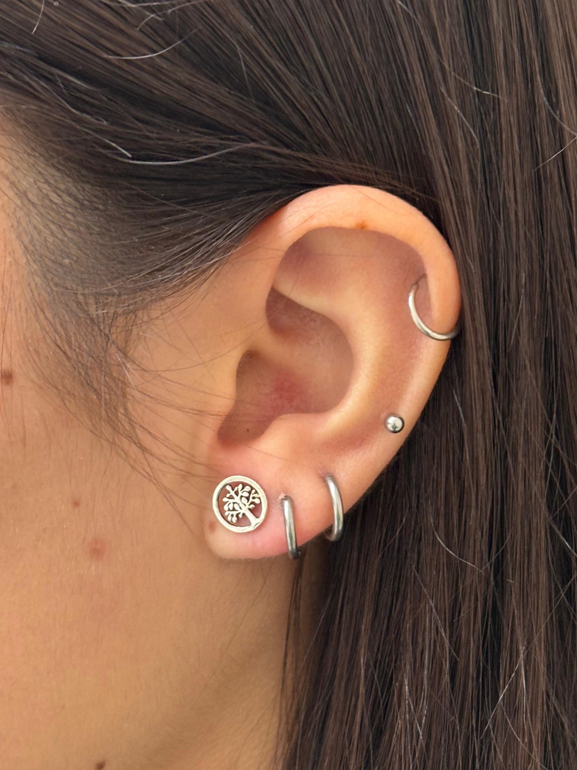 Pendiente de Plata925. Este pendiente tiene un diseño en forma de círculo de 9mm en el cual encontramos un árbol de la vida en su interior. Tiene tamaño perfecto para agujeros generales en orejas pequeñitas o para complementar otros agujeritos.
