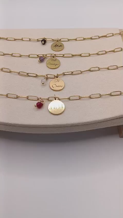 Esta pulsera está elaborada en acero inoxidable y destaca por la combinación de una delicada medalla grabable junto a una piedra natural auténtica, aportando un equilibrio perfecto entre elegancia y personalidad.