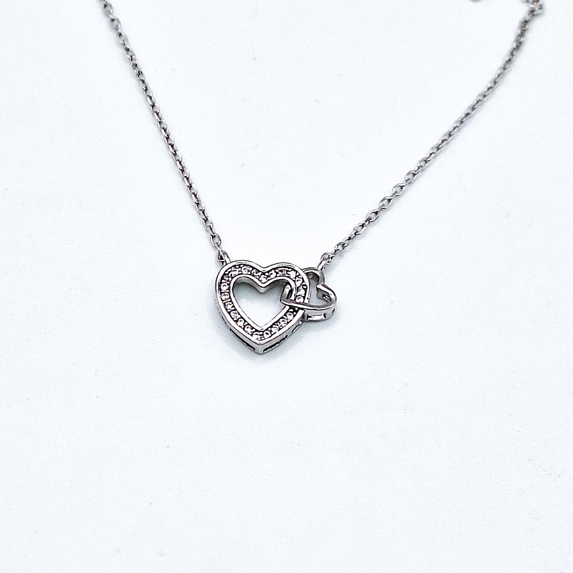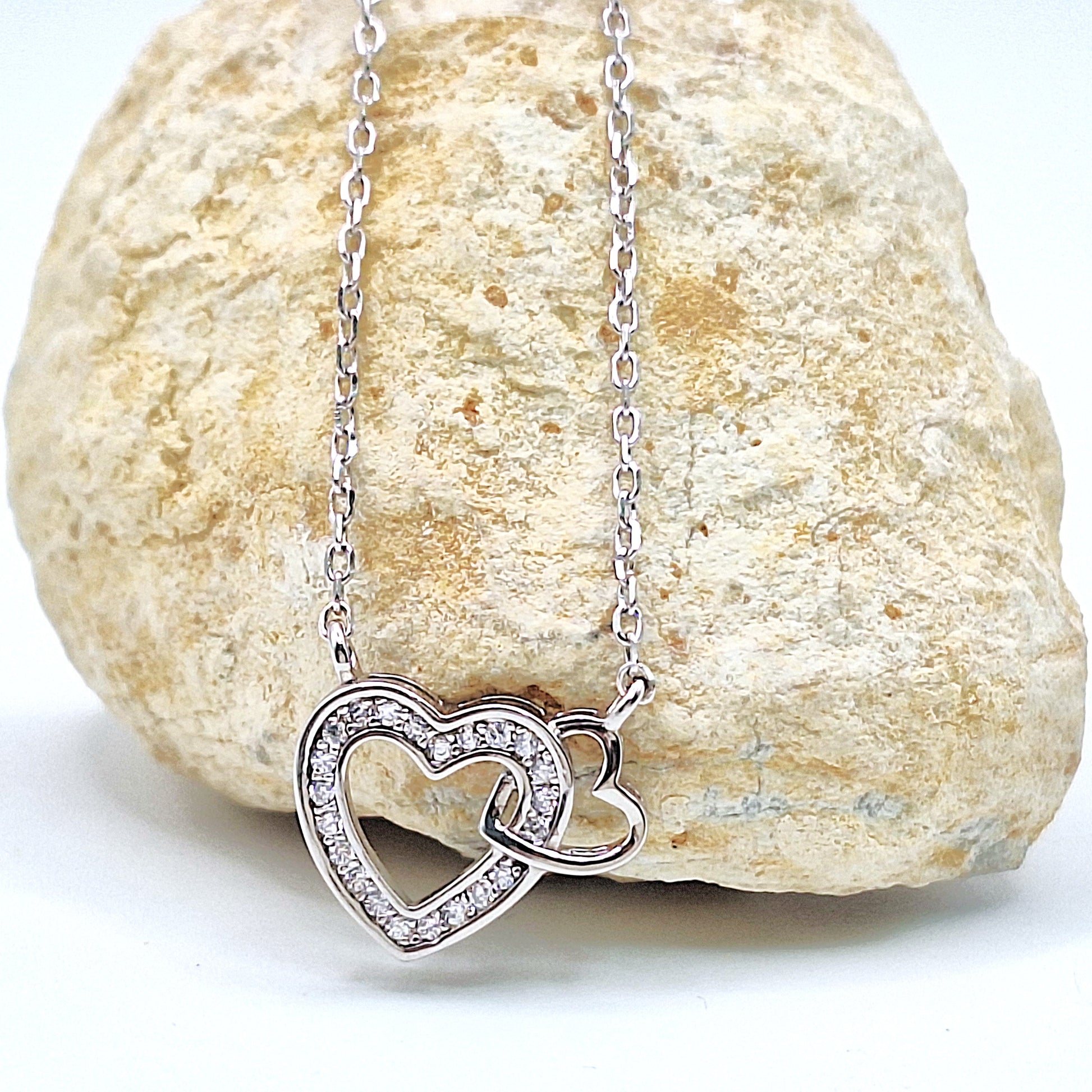 Cadena de Plata 925 con circonitas. Cadena de eslabones fina, con dos corazones entrelazados Uno grande central hueco rodeado de circonitas, y otro pequeño en Plata lisa. Ideal para combinar con la pulsera Rajat.
