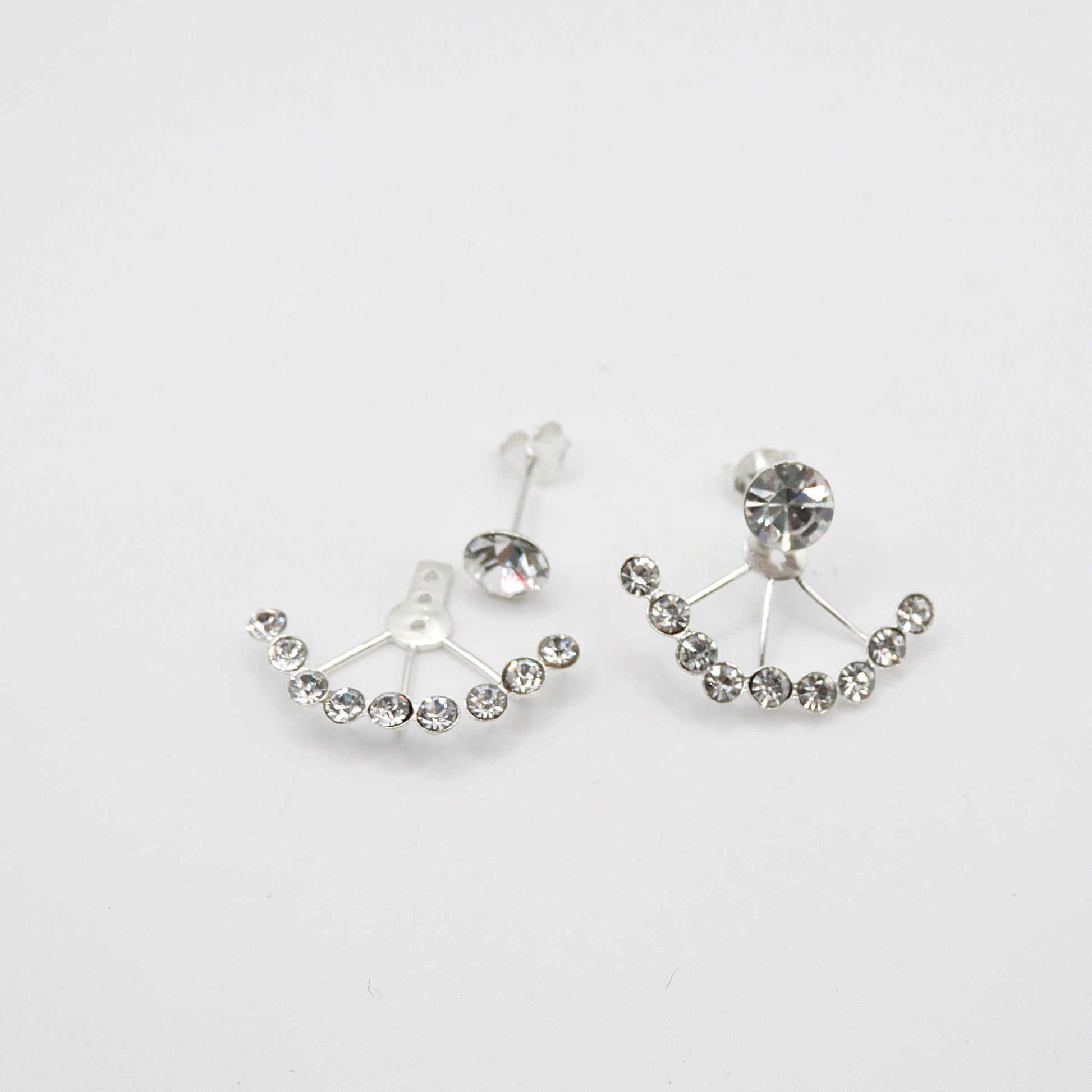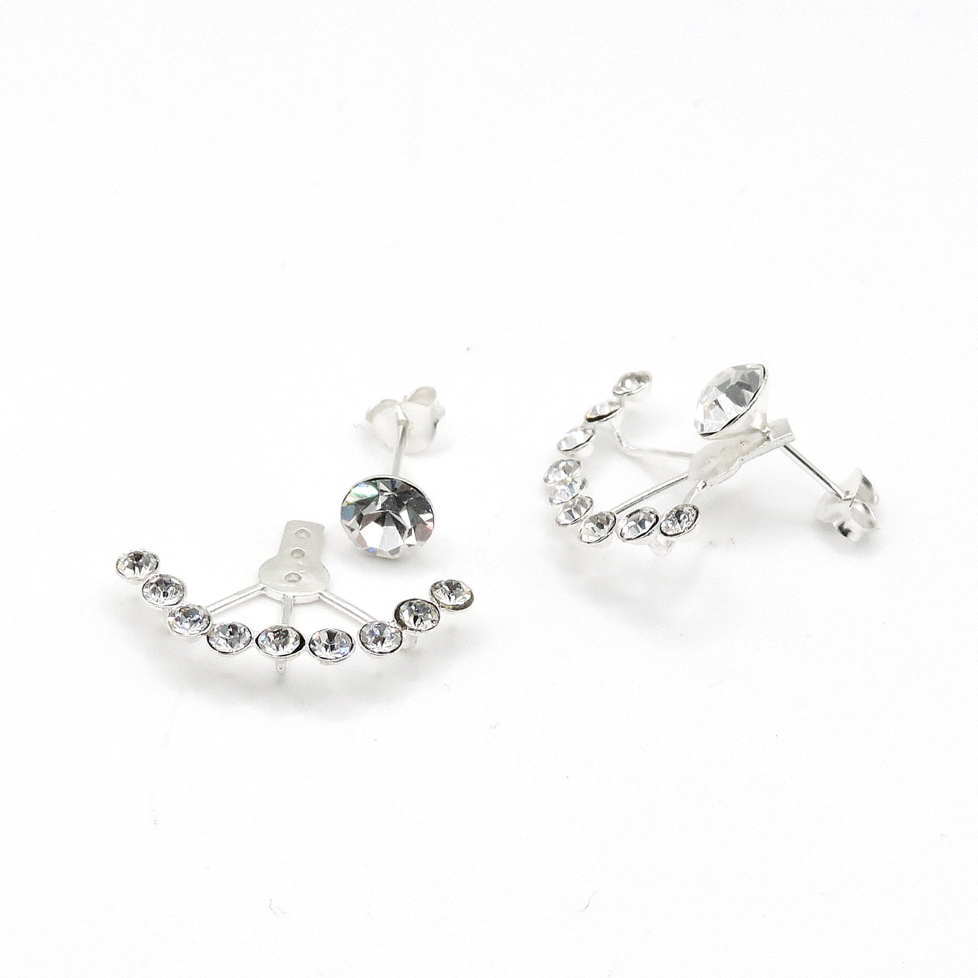Hechos en plata de Ley 925. Tiene diseño compuesto de dos pendientes. Uno que pasa por el agujerito de la oreja y otro que hace de tuerca. Está hecho en circonita engarzada con base de plata.
