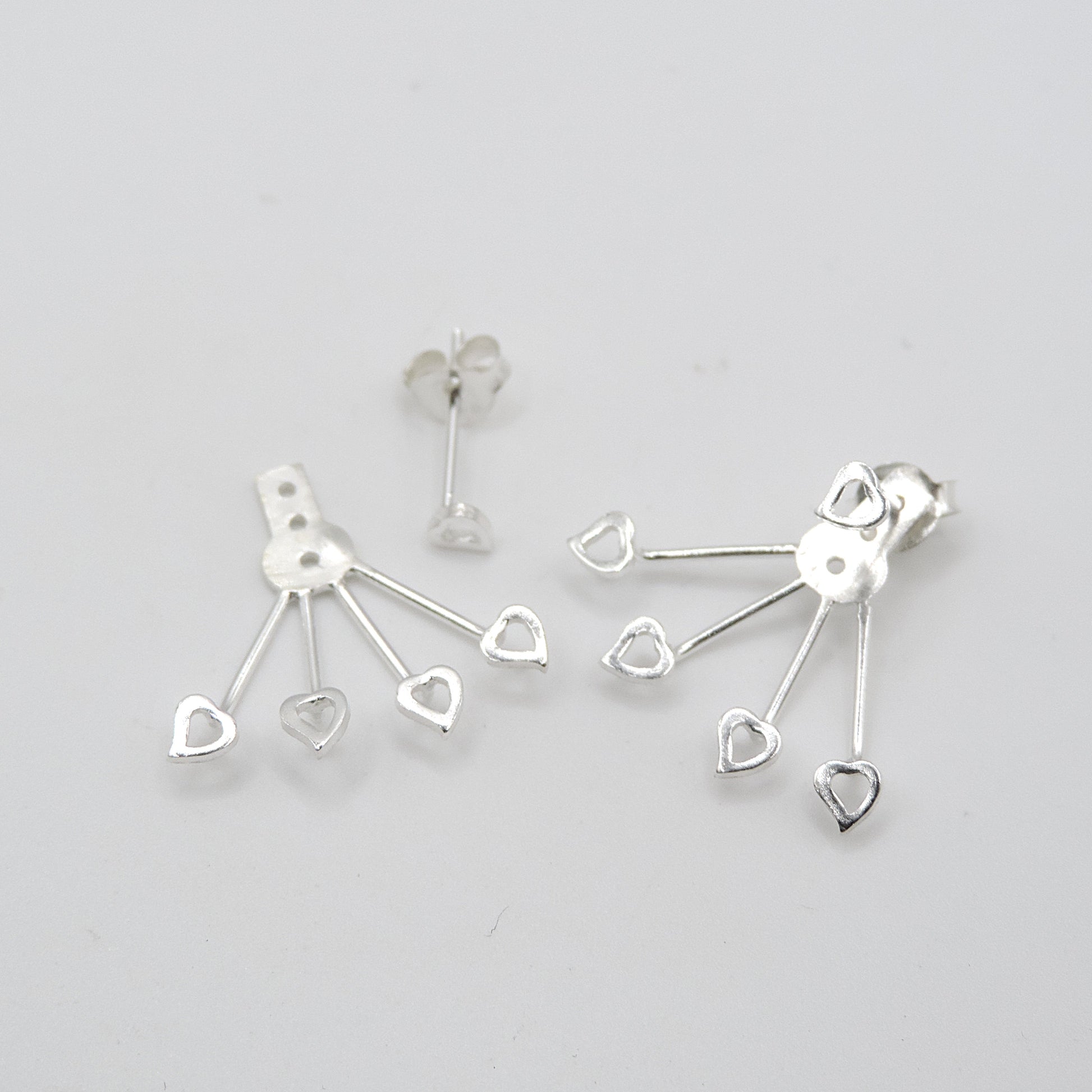 Hechos en Plata de Ley 925 . Tiene un diseño de corazones. Se compone de tres partes , un pendiente mini en forma de corazon que pasa por el agujerito de la oreja, la "canasta formada por 7 corazones y la tuerca. La canasta viene con tres agujeritos para adaptarlo a la altura de cada oreja.