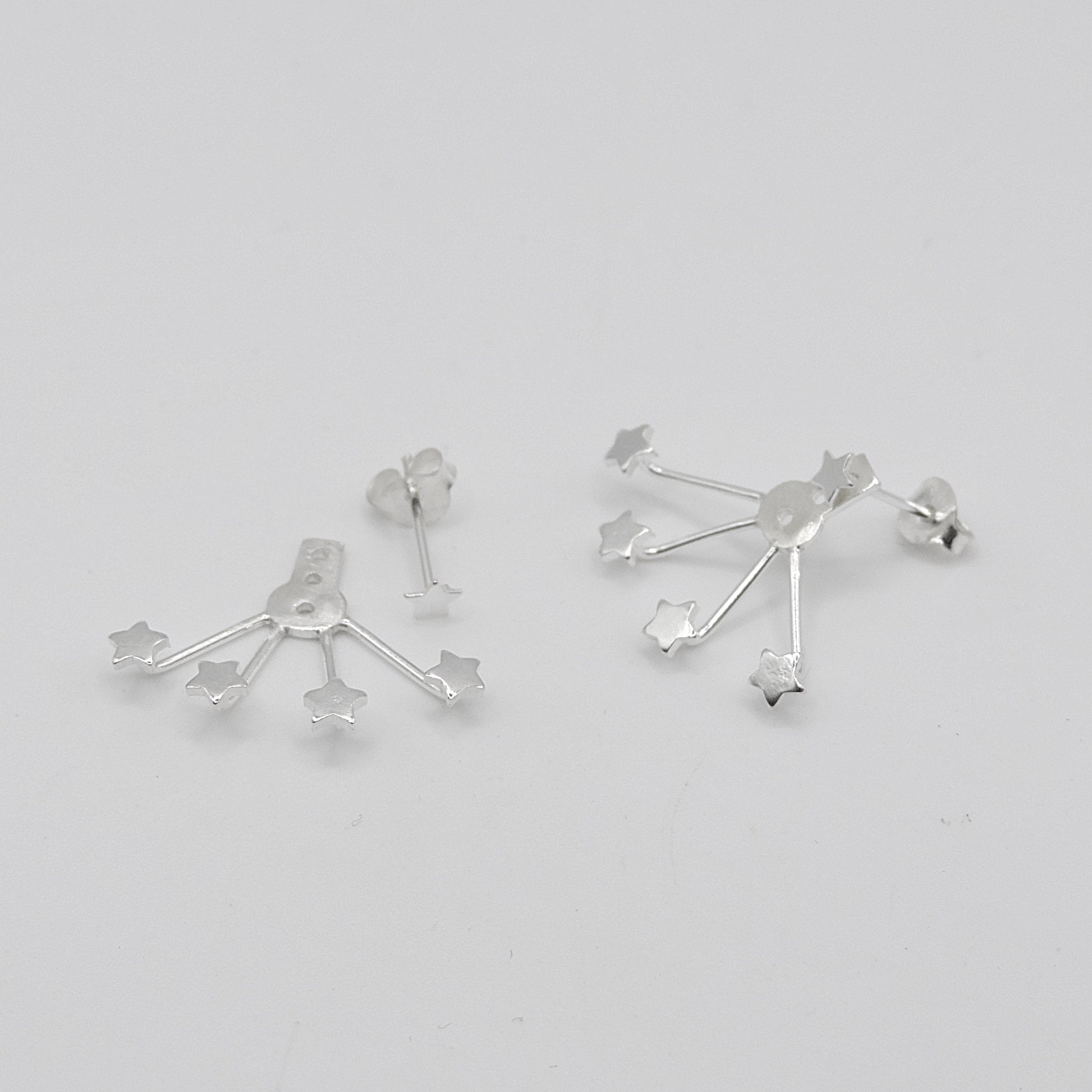 Hechos en Plata de Ley 925 . Tiene un diseño de estrellas. Se compone de tres partes , un pendiente mini en forma de estrella que pasa por el agujerito de la oreja, la "canasta formada por 4 estrellas y la tuerca. La canasta viene con tres agujeritos para adaptarlo a la altura de cada oreja.