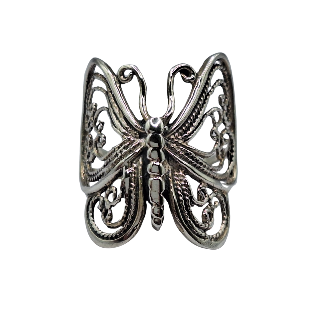 Descubre nuestro precioso anillo de plata de ley 925, con diseño de mariposa. Tamaño: 23mm alto. Peso: 3,65 gr. Disponible en todas las tallas.